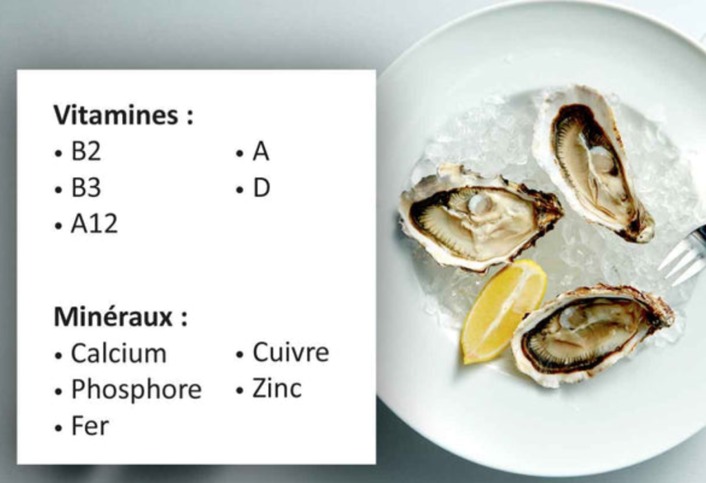 L’huître est un des aliments les plus riches en protéines. En plus, ses protéines sont d’excellente qualité et manger une douzaine d’huîtres remplace la viande ou le poisson à un repas.